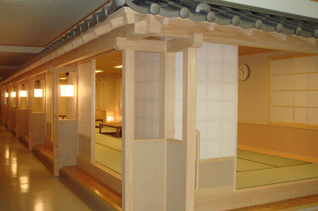 60名の利用者がくつろいでいただけるような広いフロアや40畳の掘りこたつのある和室、お風呂は広々としたジャグジー・露天風呂を設備、その他リハビリスペース、厨房等々、ゆったりとした環境をご用意しております。