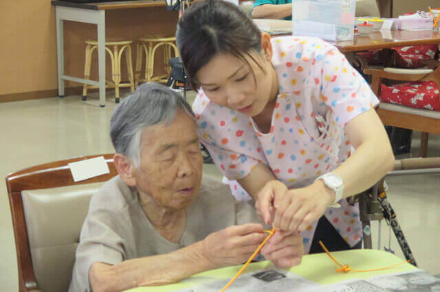 レクリエーションでは個別レクリエーションと集団レクリエーションの二つの分類をしています。 個別レクリエーションでは、手先を使った工作や手芸、脳トレなどのプリントに取り組んでいただいています。また、当センターではアイパッドをいち早く導入し、アプリケーションやインターネットを楽しんでいただいております。